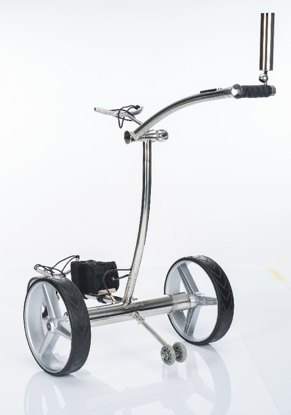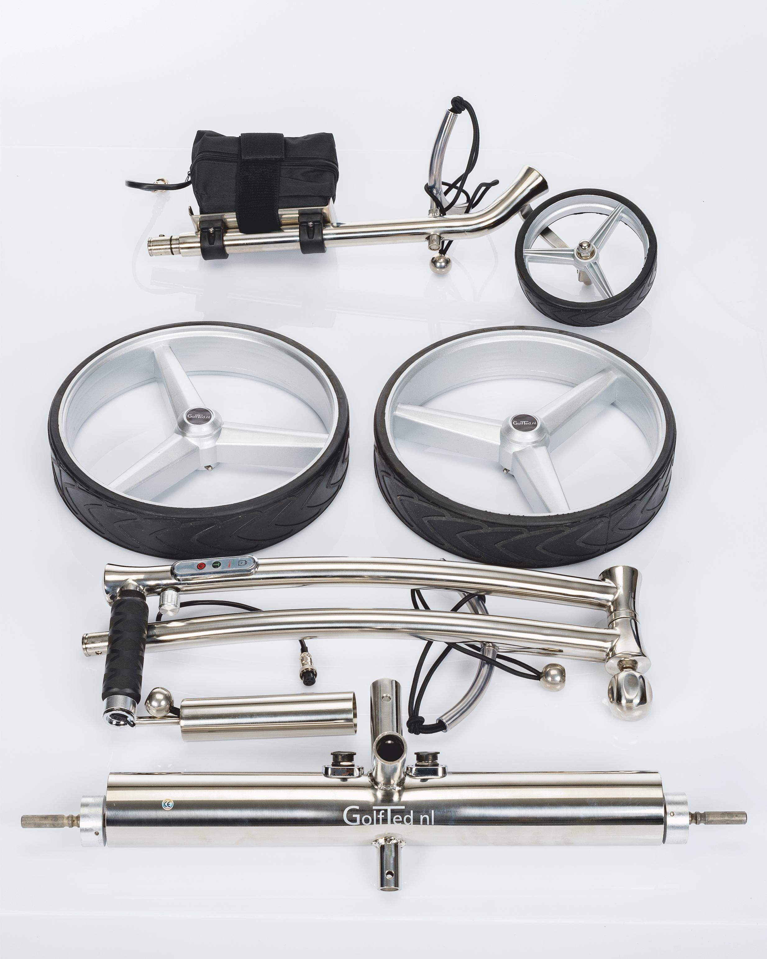 Prachtige golftrolley met een modern en strak uiterlijk. Gemaakt van hoogwaardig rvs, wind en weer bestendig. Twee krachtige motoren in de as zorgen ervoor dat u makkelijk en moeiteloos een golfronde kunt lopen. Met de lithium accu loopt men 36 holes. De trolley is makkelijk en snel in - en uit elkaar te halen. Het bestaat uit 5 onderdelen en is daarom als een compact pakket mee te nemen en neemt weinig ruimte in de auto of locker op de club. Kortom, een genot om mee te lopen en vele anderen kunnen dat beamen. Wij geven twee jaar garantie op de trolley en de accu.