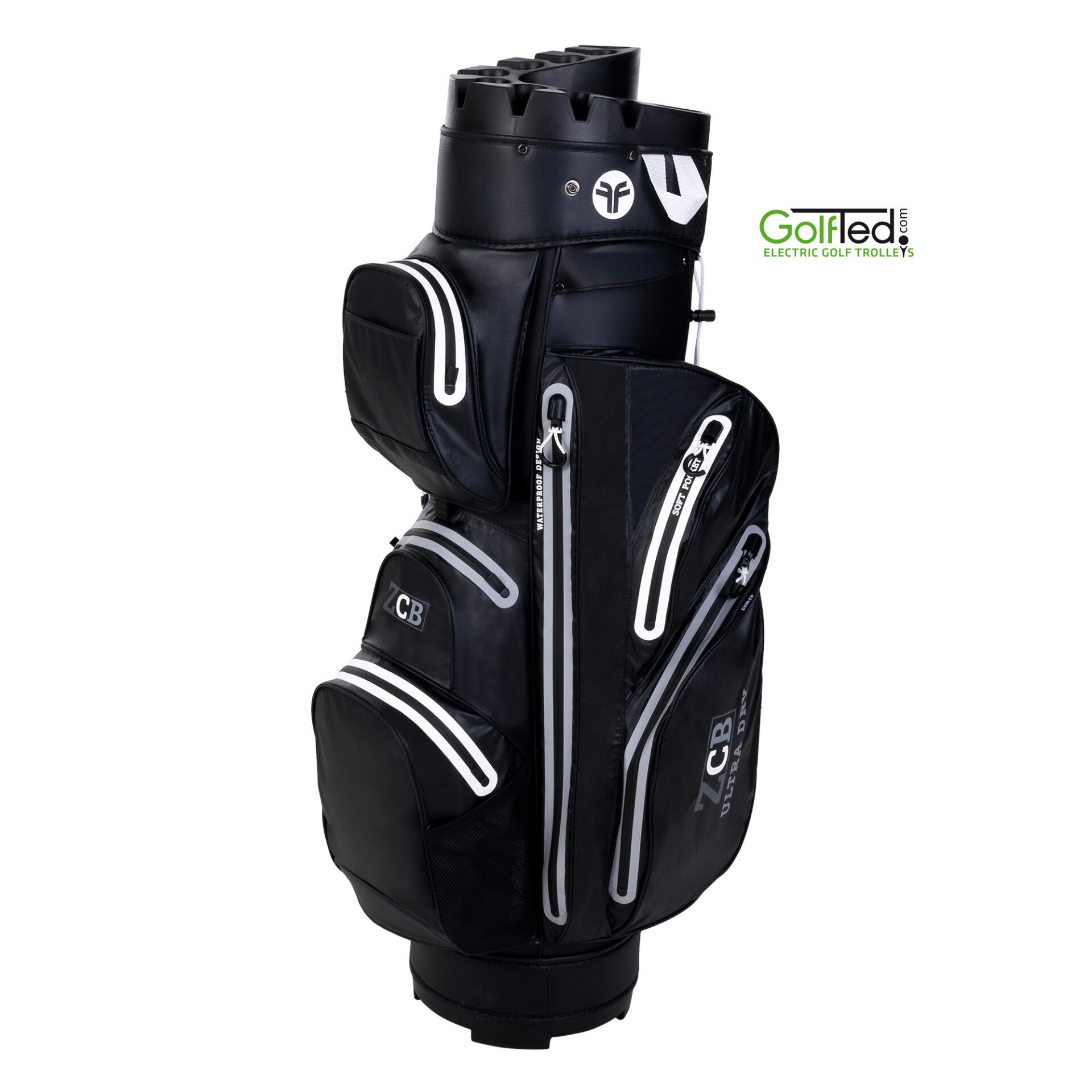 COMBI DEAL Elektrische Carbon Golftrolley GT-CR (met afstandsbediening, semi vouwbaar) + WATERDICHTE GOLFTAS